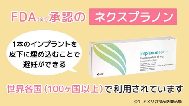 皮下(避妊)インプラントは日本の厚生労働省にあたるアメリカ食品医薬品局(FDA)に承認されているほか、世界保健機関(WHO)でもその高い有効性と安全性を認めており、現在100か国以上で使用されています。現在日本ではまだ未承認のものですが、避妊だけでなく、月経困難症や過多月経、PMSにも効果を認めています。