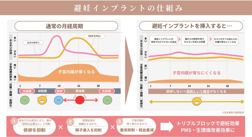 皮下(避妊)インプラントに含まれるプロゲスチンが体内に放出されると、妊娠を促す黄体形成ホルモン(LH)の分泌が抑制され、上記のような作用が起こります。